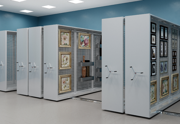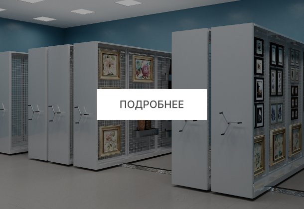 Если стеллажи для картин установить на передвижные основания, то это обеспечит не только правильные условия хранения, но и сэкономит 50% занимаемых площадей.